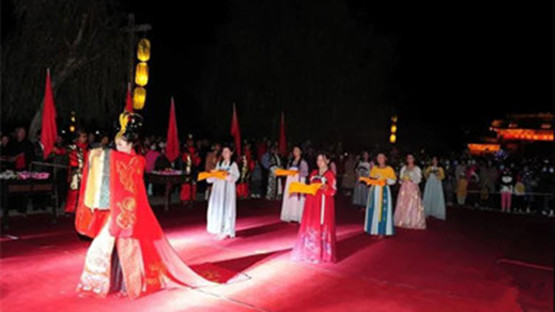 晚上8時(shí)30分,在優(yōu)美動(dòng)聽的漢唐舞曲和踏鼓舞演奏中,月牙泉小鎮(zhèn)“歲次庚子年拜月會(huì)”正式拉開帷幕,隨著氣勢恢宏、深沉悠揚(yáng)的樂曲,24名身著古裝的“文臣武將”手持月旗,邁著莊嚴(yán)穩(wěn)重的步伐,分列祭臺(tái)兩側(cè)。隨后在主祭的帶領(lǐng)下,8名圣女手捧各式貢品緩步登臺(tái),在皓月銀輝中虔誠致祭。主祭在凈手后三上香、三敬酒,于月光與燭光映照之中對月讀祝,抑揚(yáng)頓挫的讀祝聲久久在夜空回響,誦畢,主祭焚燒祭文。伴隨著贊禮的高聲“禮成”,主祭及“圣女”們將月餅與瓜果分享給現(xiàn)場拜月的數(shù)千市民和游客。