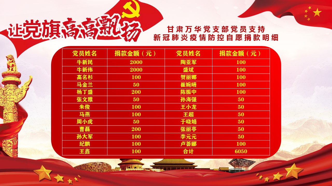 截止到當日17時,共有25名萬華集團黨支部黨員、預備黨員、入黨積極分子自發(fā)地進行了捐款,捐款總額6050元。這筆捐款通過蘭州市總商會黨委統(tǒng)一捐至防疫工作最需要的第一線,主要用于慰問戰(zhàn)斗在疫情防控斗爭第一線的醫(yī)務人員、基層干部群眾、公安民警和社區(qū)工作者等,資助因患新冠肺炎而遇到生活困難的群眾和因患新冠肺炎去世的群眾家屬,慰問在疫情防控斗爭中犧牲的干部群眾家屬等。