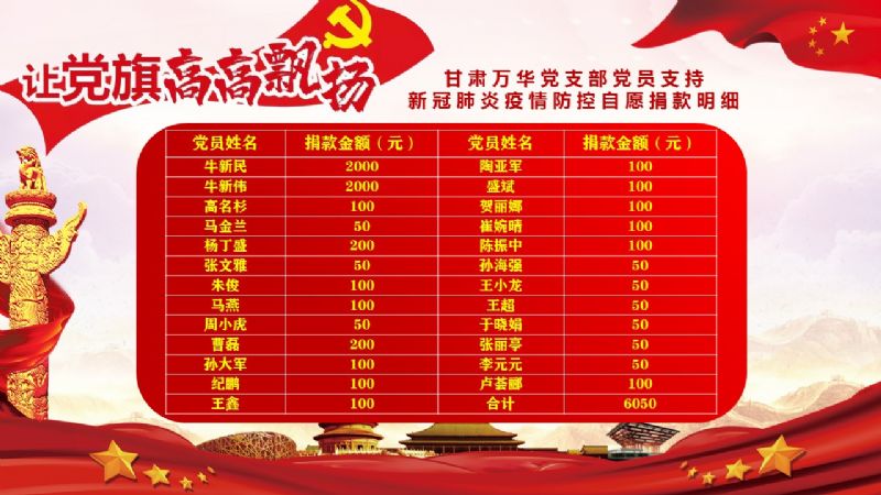新冠肺炎疫情發(fā)生以來,牽動著每位萬華黨員的心。2月28日上午,蘭州市總商會黨委發(fā)出了《關于做好基層黨組織黨員自愿捐款支持新冠肺炎疫情防控工作的通知》, 呼吁各基層黨組織開展“萬眾一心,共抗疫情”專項募捐,萬華集團黨支部黨員、預備黨員、入黨積極分子積極參與自愿捐款。